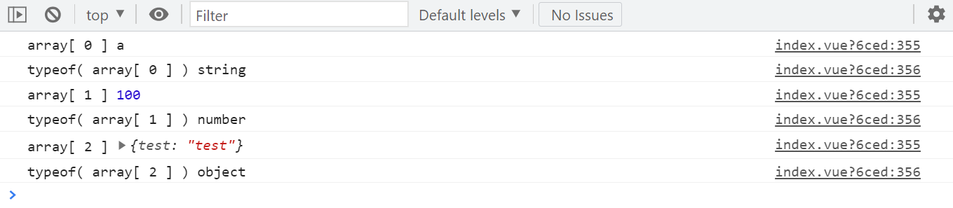 console.log( `typeof( array[ ${index} ] )`, typeof( array[ index ] ) )