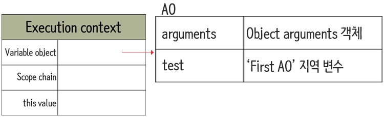 함수 컨텍스트는 현재 활성객체 AO(Active Object)를 가리킨다. 활성 컨텍스트는 전역 컨텍스트와 달리 매개변수와 인수들의 정보가 필요하다. 따라서 매개변수와 인수들의 정보를 담는 arguments object가 추가된다.