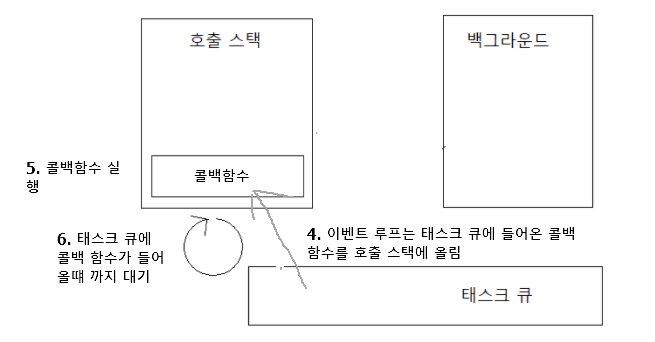 6. 이벤트 루프는 호출 스택이 비어있을때 까지 대기하다가 호출 스택이 비어있게되면 태스크 큐를 호출 스택에 쌓는다.