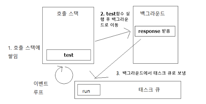 위 코드에서 test 함수는 url으로 request를 보냈다. 무언가 처리를 하고 response가 오기까지 10초가 걸렸다면, 10초 동안 다른 동작을 하지 못했을 것이다. 이와 같은 상황을 극복하고자 JS는 이벤트 루프라는 매커니즘과 비동기 콜백을 사용한다.