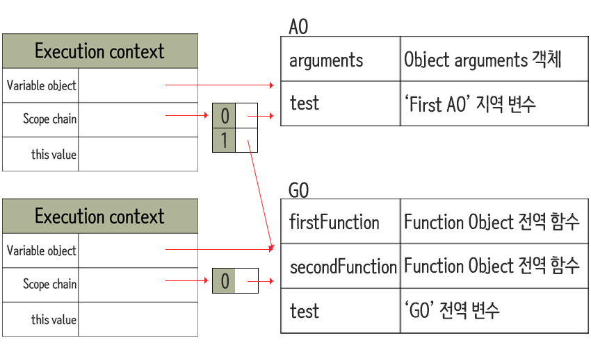 즉, AO(firstFunction)에서 변수 test를 찾아보고 AO에 없다면 스코프 체인을 통해 상위 컨텍스트에 접근해 변수 test를 찾게된다.
